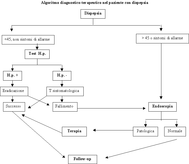 Ricordata l'importanza di eseguire immediati accertamenti nei soggetti con dispepsia insorta oltre il 45' anno d'età o in presenza di situazioni cliniche suggestive di patologie gravi, nessuna delle differenti proposte suggerite in letteratura può essere considerata a priori ottimale, o superiore alla altre, in quanto non sono stati tuttora realizzati studi idonei a comparare differenti approcci. La sola, storica, proposta di terapia con H2-antagonisti per tutti i pazienti, sembra decisamente inadeguata perché tale terapia risulta di efficacia inferiore all'eradicazione dell'H. pylori nella malattia peptica, di scarsa utilità complessiva nella gestione delle forme funzionali, e deludente in termini farmacoeconomici rispetto ad un approccio endoscopico diretto.